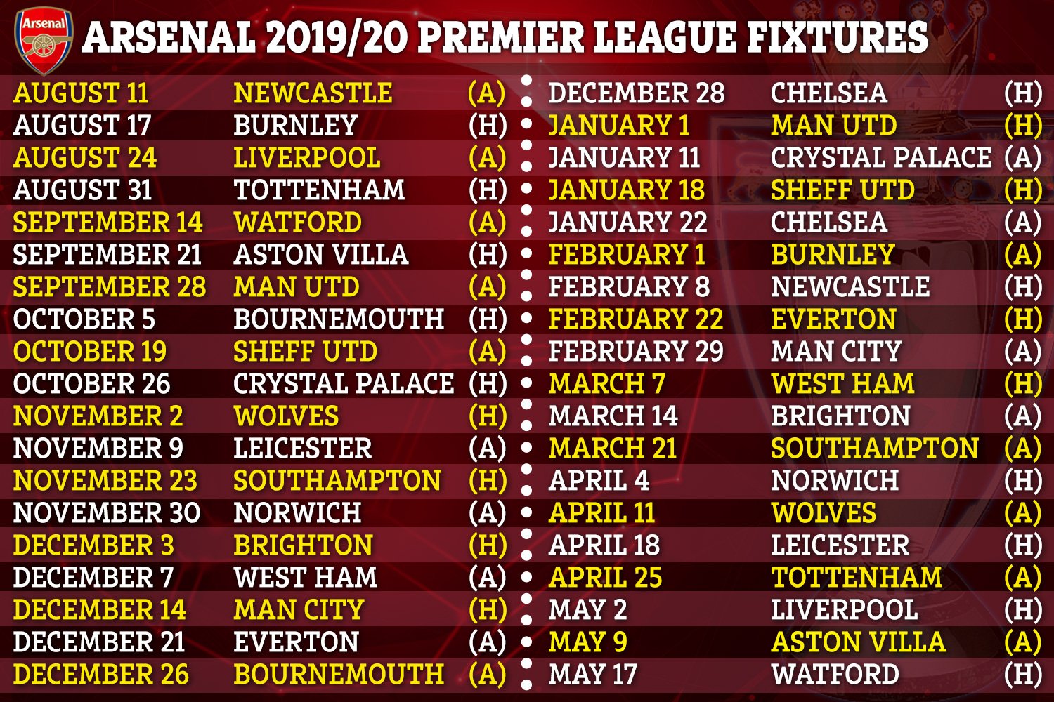 2019/20 Premier League fixtures Full schedule for Arsenal, Tottenham